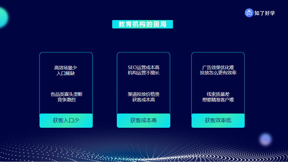 同時,張老師為在場的教育培訓機構詳細闡述了知了好學平臺針對機構痛點和訴求,提供了獲客難題解決方案。面對培訓機構獲客入口少、成本高、效率低的三大痛點,平臺從海量曝光場景出發,覆蓋搜索、信息流、地圖等多渠道用戶曝光場景來豐富機構獲客入口;從一次入駐,實現多端入口結構化信息呈現,即享小程序建店分發紅利來降低機構獲客成本;并借助百度強大的用戶定位+智能推薦算法來幫助機構觸達精準用戶,將用戶留下的咨詢、試聽等需求,通過電話、表單、IM智能客服分發給機構,來提升機構獲客效率。如此一來,能夠全方位解決機構獲客難題。