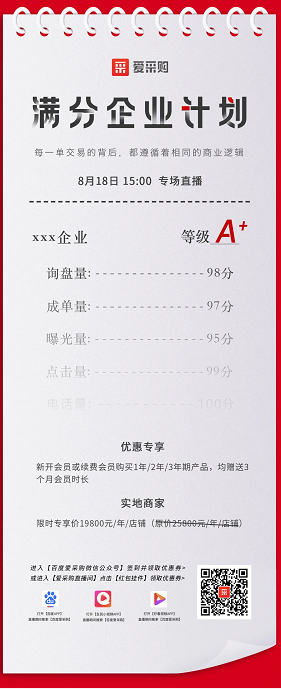 2020上半年企業線上營銷迅速發展,到底該怎么玩轉線上營銷,不妨看看優秀企業是如何做的。前人的思考,我們的階梯,18號愛采購攜手眾多明星企業為您分享#企業年中成績單#,點擊鏈接【直播預告】百度愛采購-滿分企業計劃專場直播網頁鏈接或掃描圖中二維碼立刻免費預約,觀看直播!